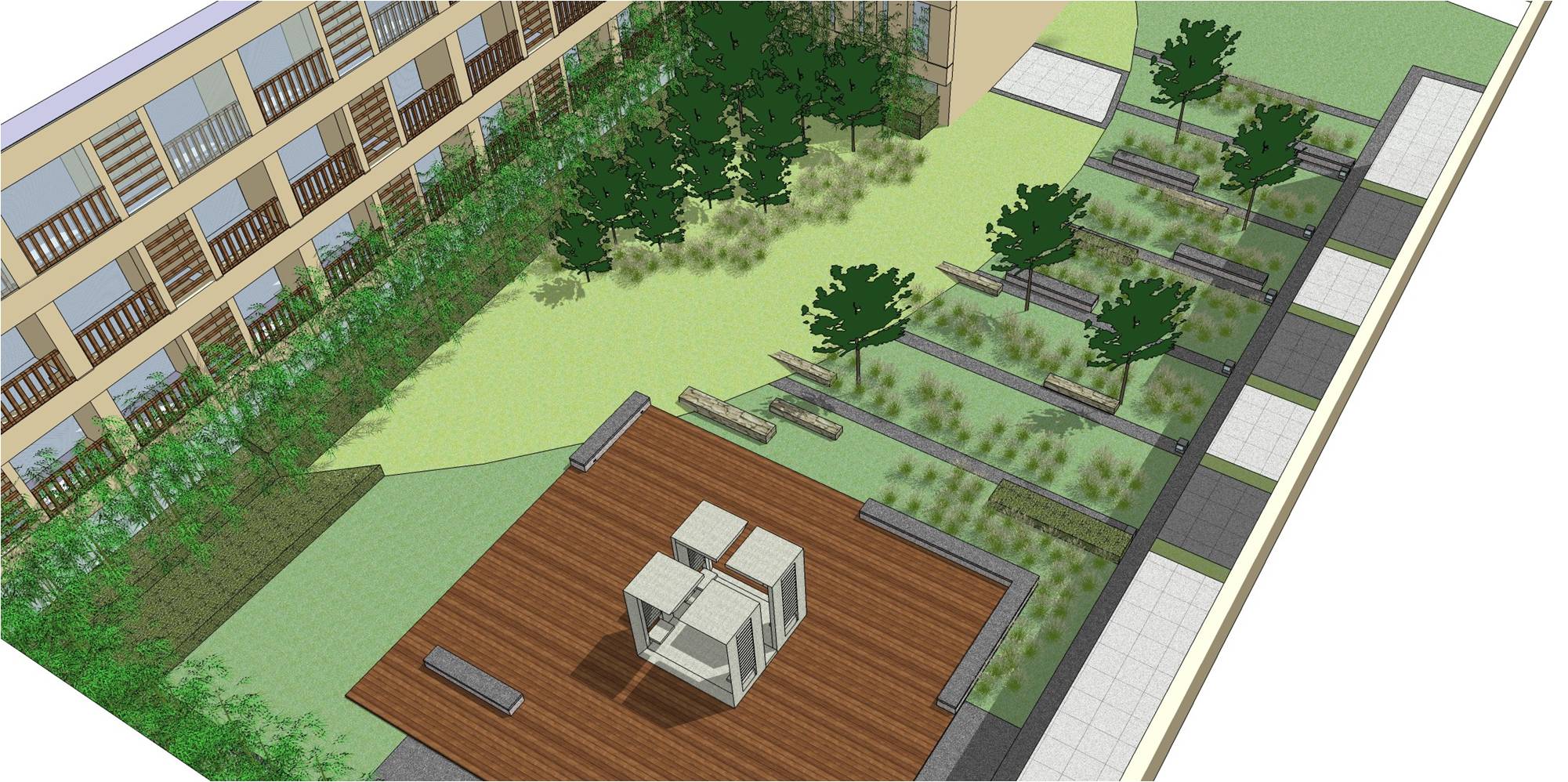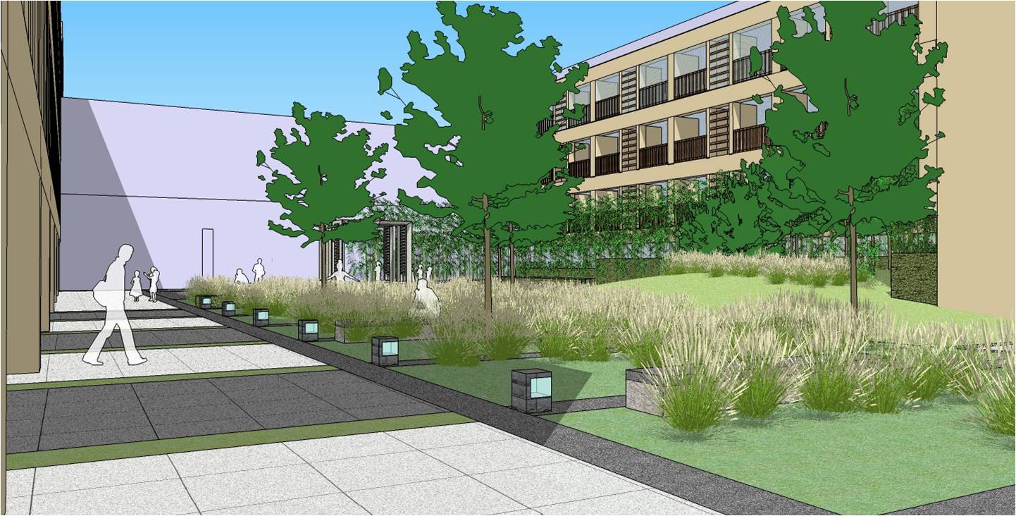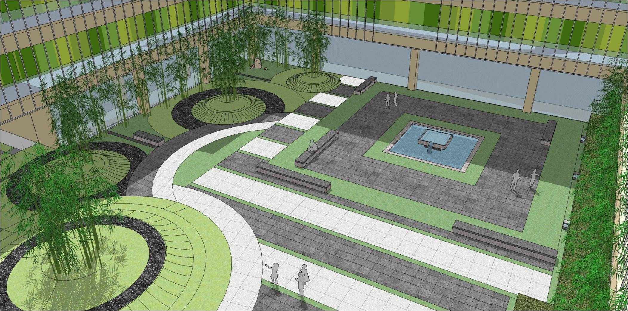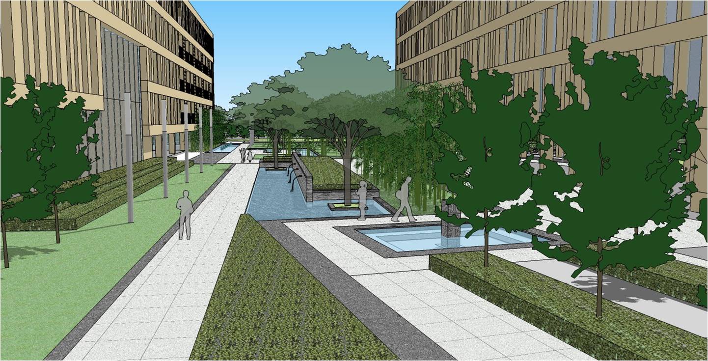 在原始景觀規(guī)劃中,報(bào)告廳通往操場(chǎng)需要從中心廣場(chǎng)兩側(cè)繞行,十分不便,中心廣場(chǎng)也無法得到充分的利用。新的景觀平面布局優(yōu)化中,在中心廣場(chǎng)設(shè)計(jì)了多條幾何線形的道路,不僅僅增加了藝術(shù)的視覺效果,還充分滿足了交通流線的需求,同時(shí)也為學(xué)生在中心廣場(chǎng)停留提供了便利。